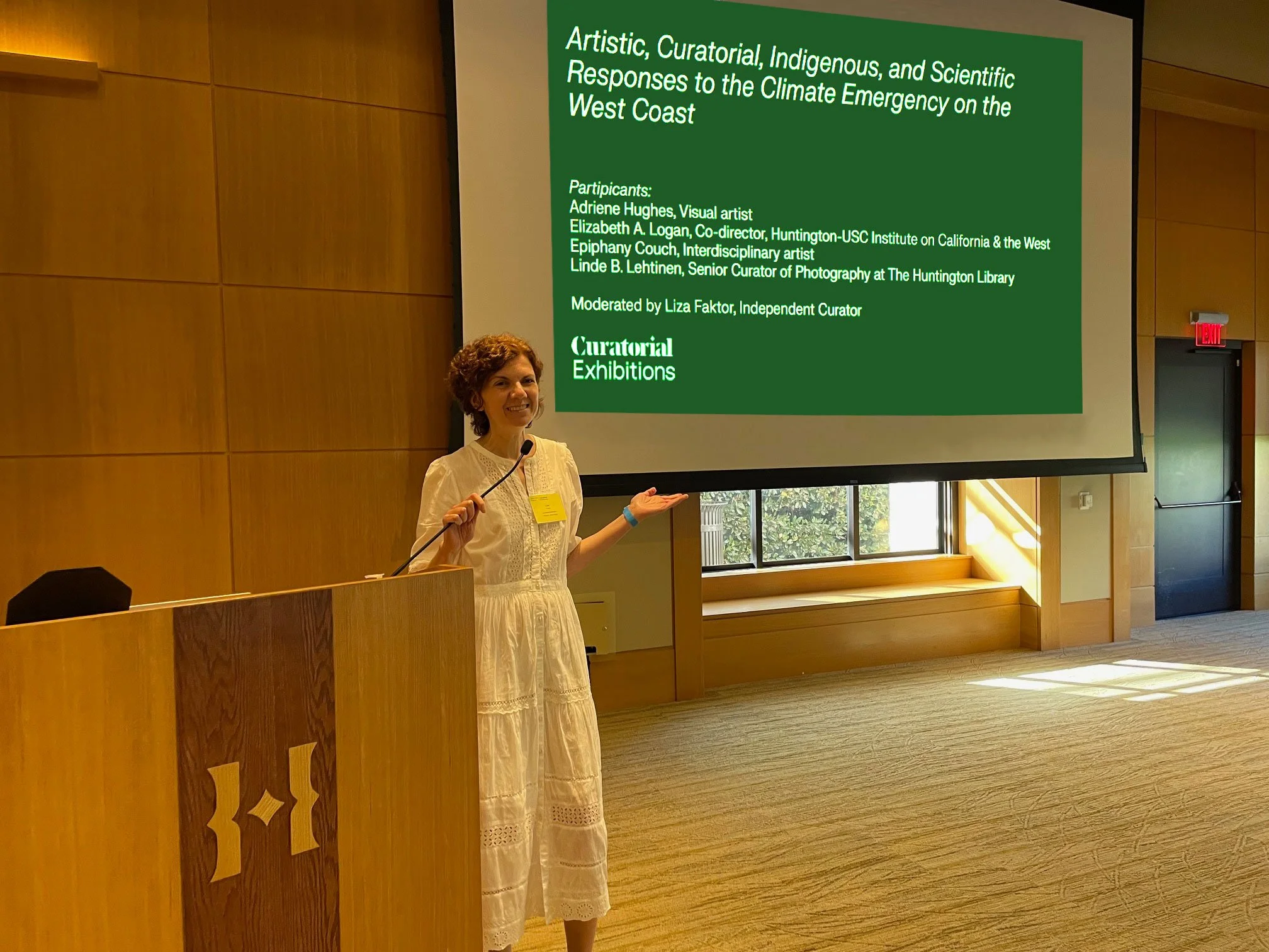 The presentations included Elizabeth Logan’s overview of the Huntington-USC Institute on California & the West signature initiative, West on Fire; Adriene Hughes’ ongoing series Secret Life of Trees that explores Pacific Northwest forests through an innovative mixed-media approach; Epiphany Couch’s examination of seasonal transformation on tribal lands in Washington State in Before the Fire Lit My Dreams; and Linde B. Lehtinen’s discussion of the Huntington Library photography collection’s engagement with the history of fire and changing climate in the West.