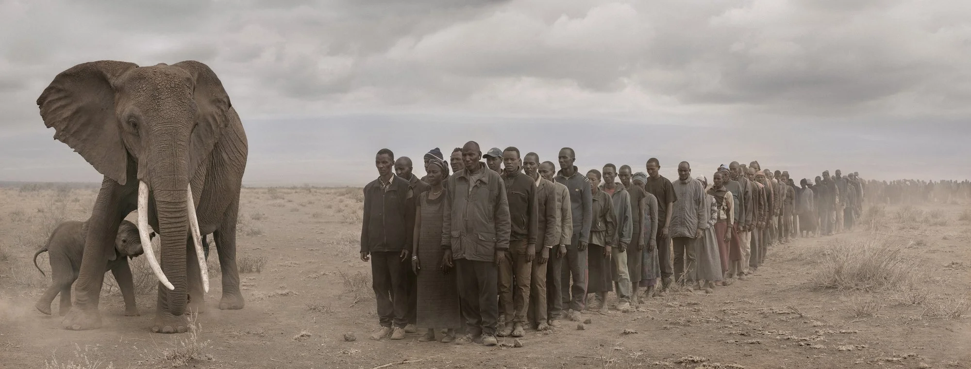 The Amboseli National Park served as a backdrop to the series of photographs in this exhibition. This region is also occupied by the Maasai people who inhabit this land without protected reserve status and are one of the few remaining communities that have advocated a peaceful coexistence with local wildlife. Although the region has experienced some economic growth due to the rise in horticulture, most citizens in the region remain in extreme poverty which led to the rise in illegal animal poaching. However, the work of conservationists and non-profit organizations such as the Big Life Foundation, intent on stopping this violent activity, have successfully lowered its prevalence. Established in 2010 by Nick Brandt, Richard Bonham and Tom Hill, the Big Life Foundation protects 1.6 million acres of wilderness in the Amboseli-Tsavo-Kilimanjaro ecosystem. Their approach is holistic in nature and modeled intently on community-based collaboration informed by their philosophy that “conservation supports the people and people support conservation.”