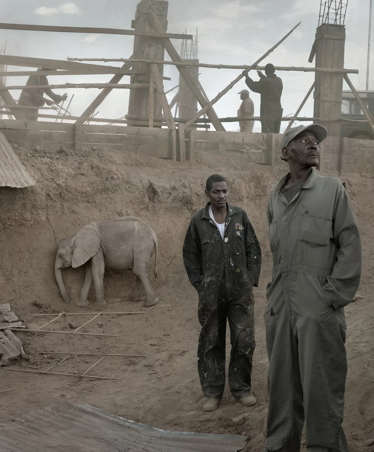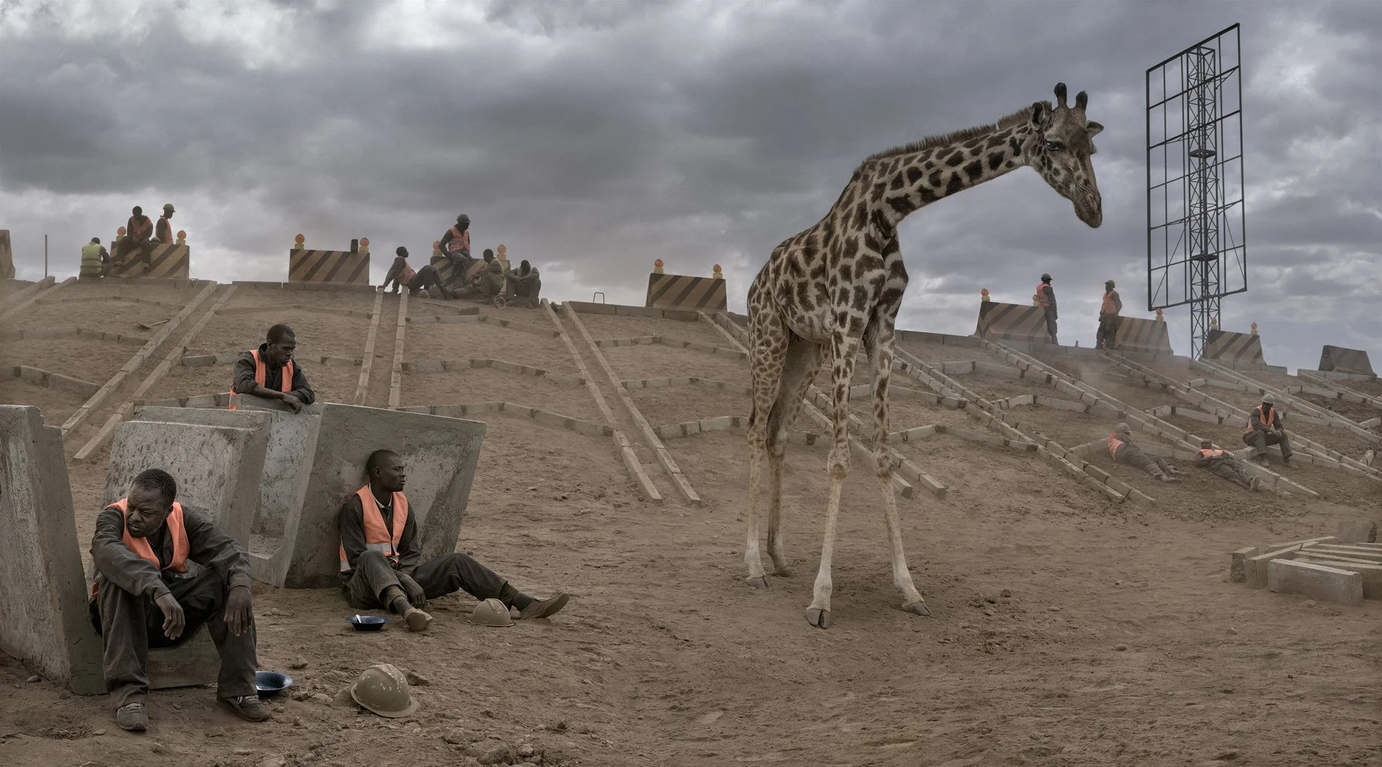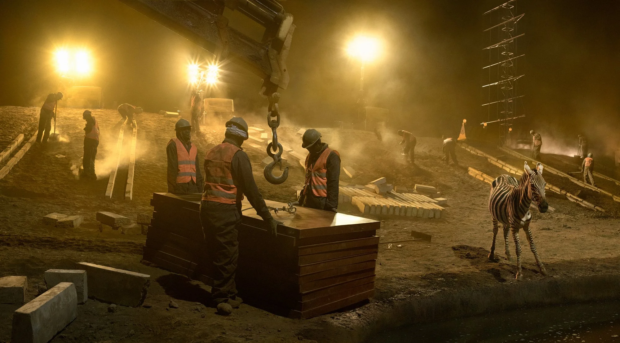Technically, each image is a combination of two moments in time, captured weeks apart, almost all from the exact same locked-off camera position. Initially, a partial set was built and lit. Weeks, even months followed, while the animals that inhabited the region became comfortable enough to enter the frame. Once the animals were captured on camera, the full sets—bridge and highway construction sites, a petrol station, a bus station and more—were built. A second sequence was then photographed with the full set and a large cast of people drawn from local communities and beyond.