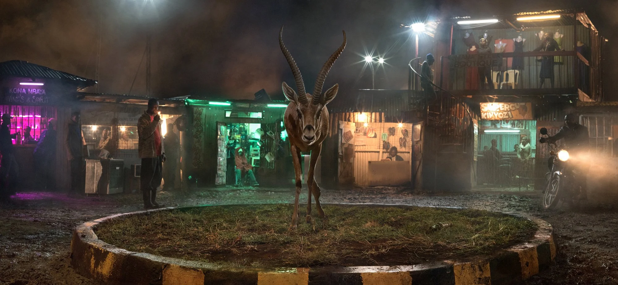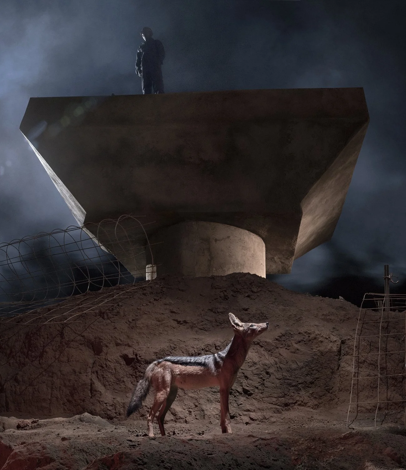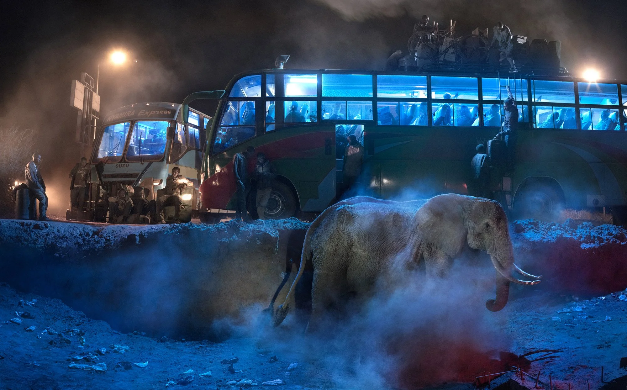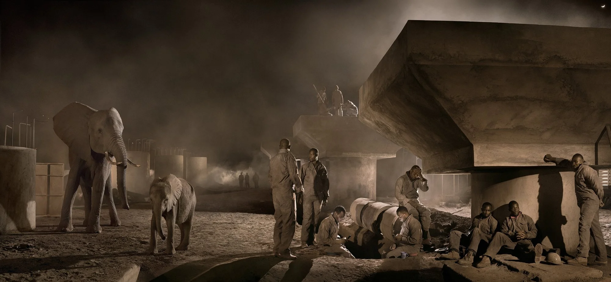 Technically, each image is a combination of two moments in time, captured weeks apart, almost all from the exact same locked-off camera position. Initially, a partial set was built and lit. Weeks, even months followed, while the animals that inhabited the region became comfortable enough to enter the frame. Once the animals were captured on camera, the full sets—bridge and highway construction sites, a petrol station, a bus station and more—were built. A second sequence was then photographed with the full set and a large cast of people drawn from local communities and beyond.